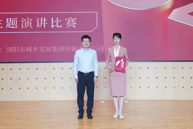 共青團瀏陽市委書記鄭騰飛為一等獎獲獎選手胡丹頒獎。