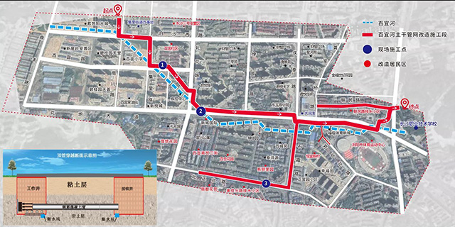 百宜河綜合整治項目是完善城市排水管網系統,助力打贏“藍天碧水保衛戰”的重要舉措,改造范圍涉及到百宜河流域老城區段2.84平方千米,服務人口達5萬人,主要是對花炮大道、勞動北路、北正北路、石霜路、聯民路、百宜路、白沙西路等市政道路進行雨污分流改造,建設一座一體化泵站(規模為6000噸/天)。